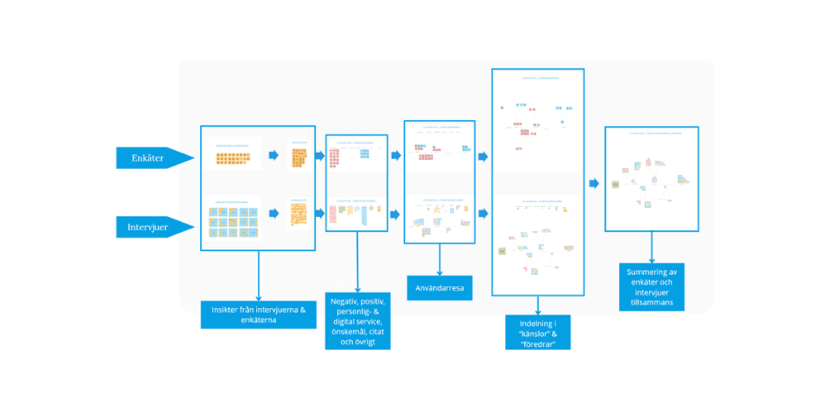 To collect user insights, a digital survey was created by me and my three classmates and sent out on social media, school platforms and public places around Stockholm. This was followed by about 20 in-depth user interviews with Folksam's customers. The research focused on customer satisfaction, usability issues, pain points in the user flow and the stages where users most often gave up and contacted customer service instead.