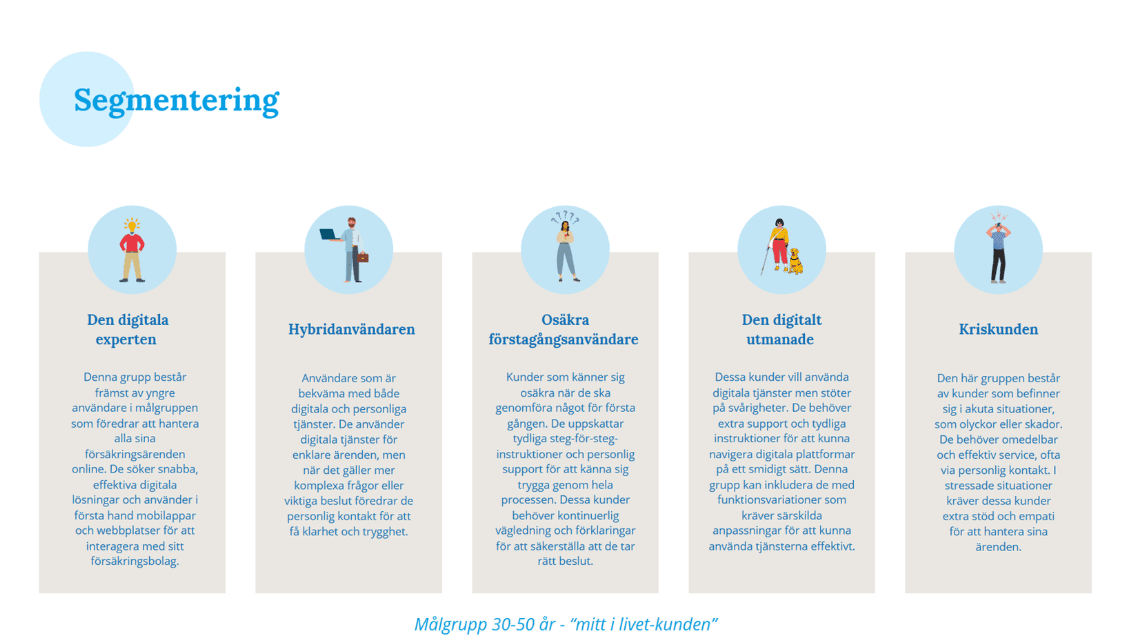 Using affinity diagrams, user journeys and personas, we were able to derive actionable insights. Based on these insights, design concepts and improvement ideas were developed using Figma and Mural and the final presentation was made in Canva. The results and recommendations were presented to Folksam's UX team.